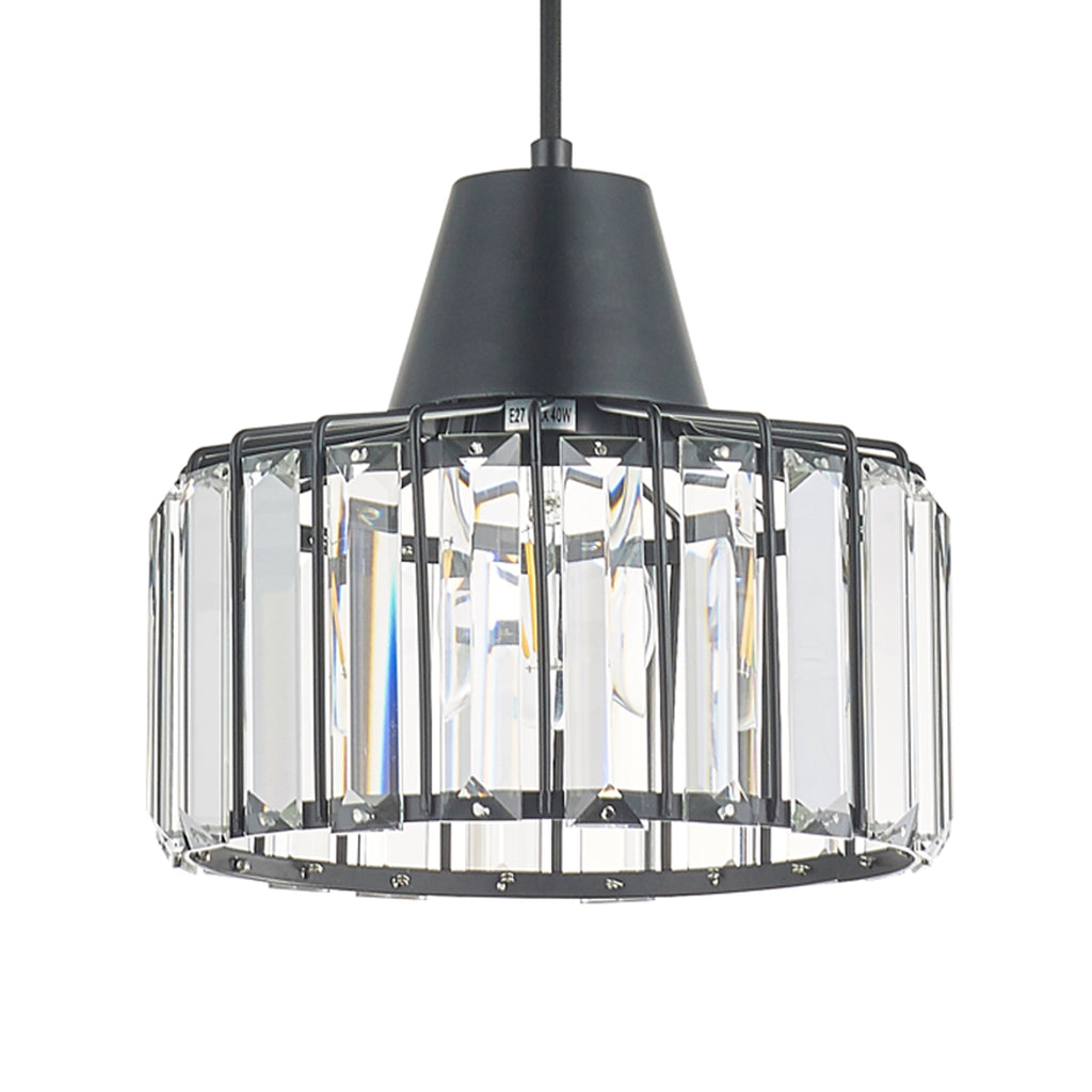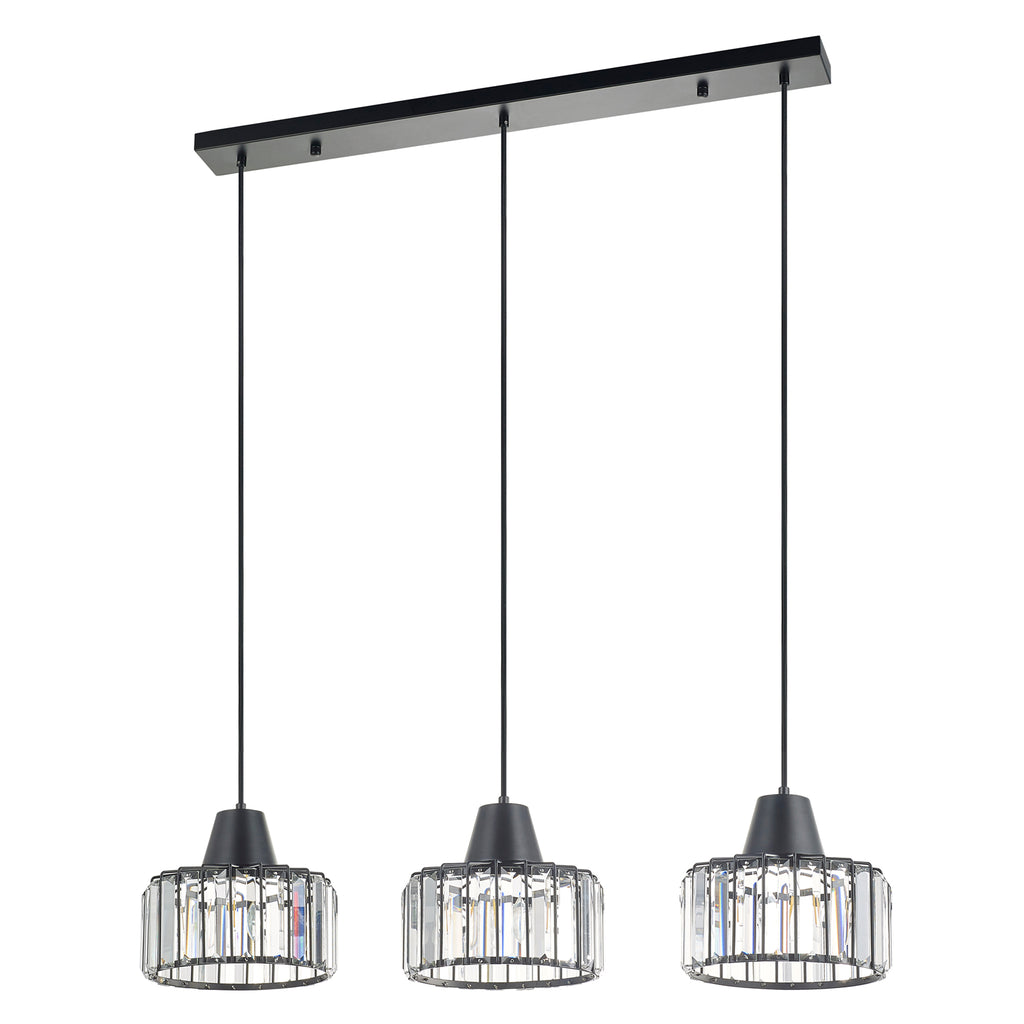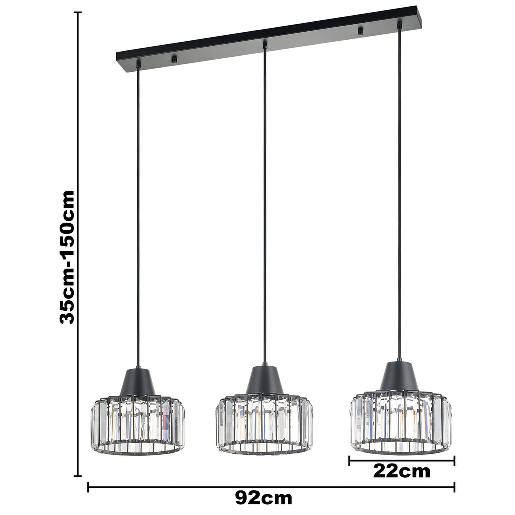 3 Light Bar Black Finish Pendant Light with Decorative Crystal Shades, Adjustable Height, Dimmable, Class 2 Double Insulated