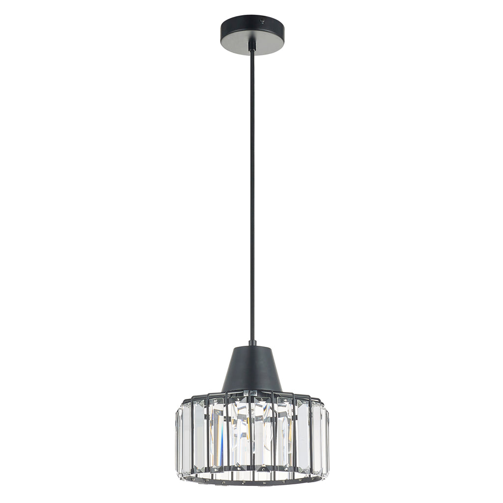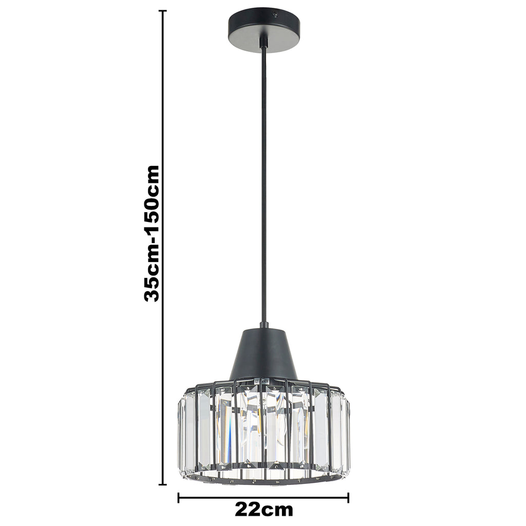 Single Black Finish Pendant Light with Decorative Crystal Shade, Adjustable Height, Dimmable, Class 2 Double Insulated
