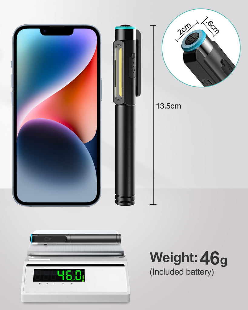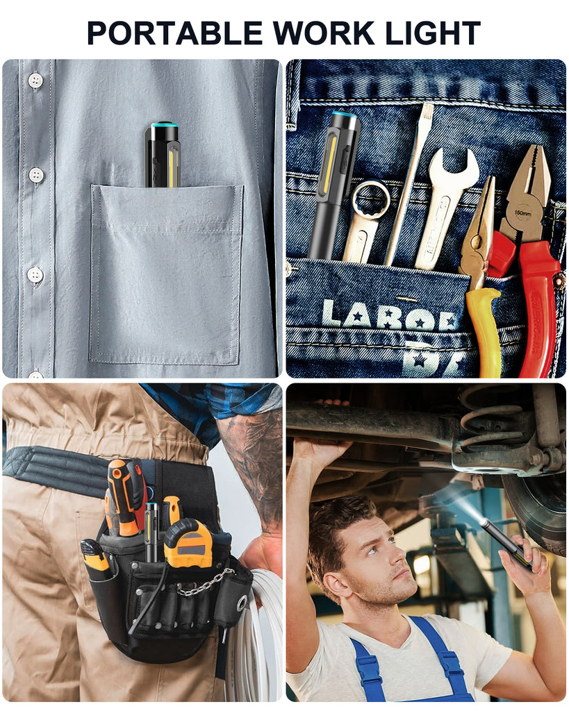 - Portable and Exquisite Design - Designed like a pen, this work light features a strong magnetic clip for secure attachment to iron, clipping onto a belt or tool bag.