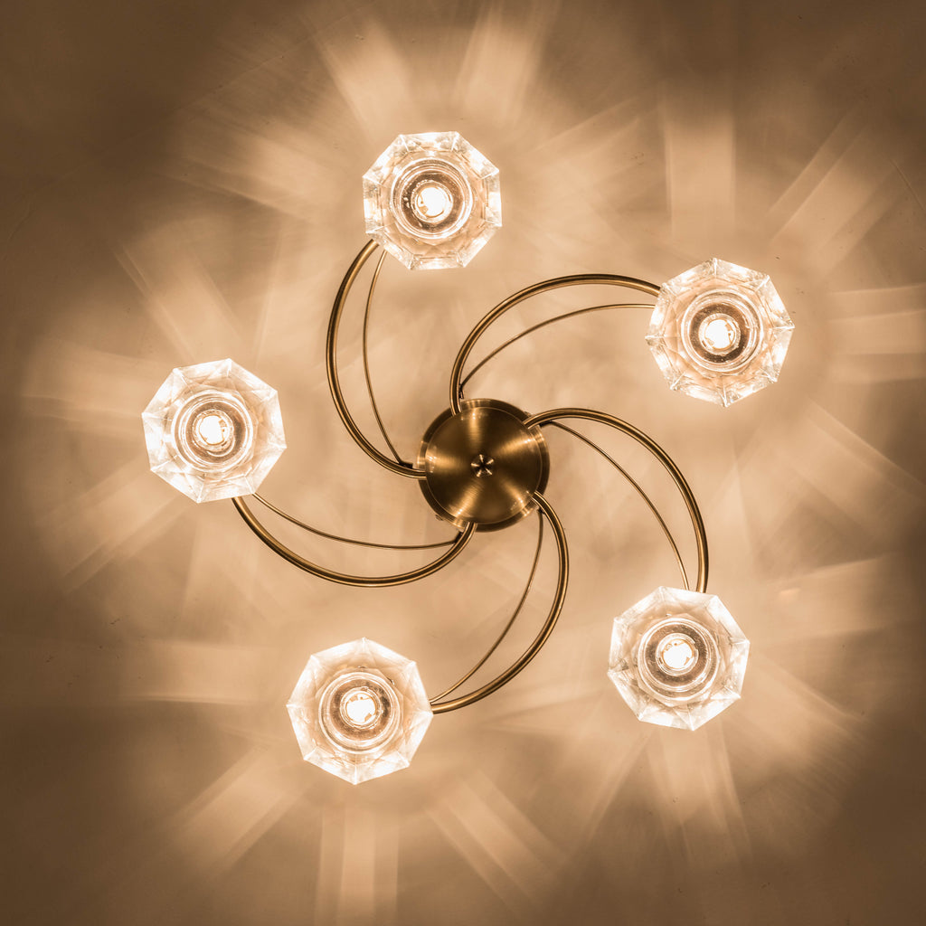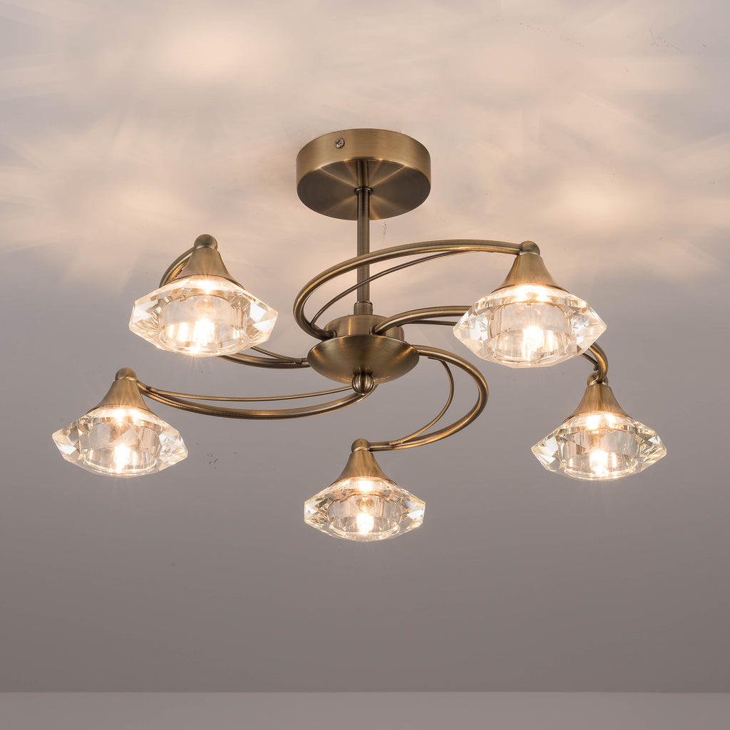 5 Lights Semi-Flush Ceiling Light, Antique Brass Finish, Faceted Octagonal Glass Shades, Dimmable