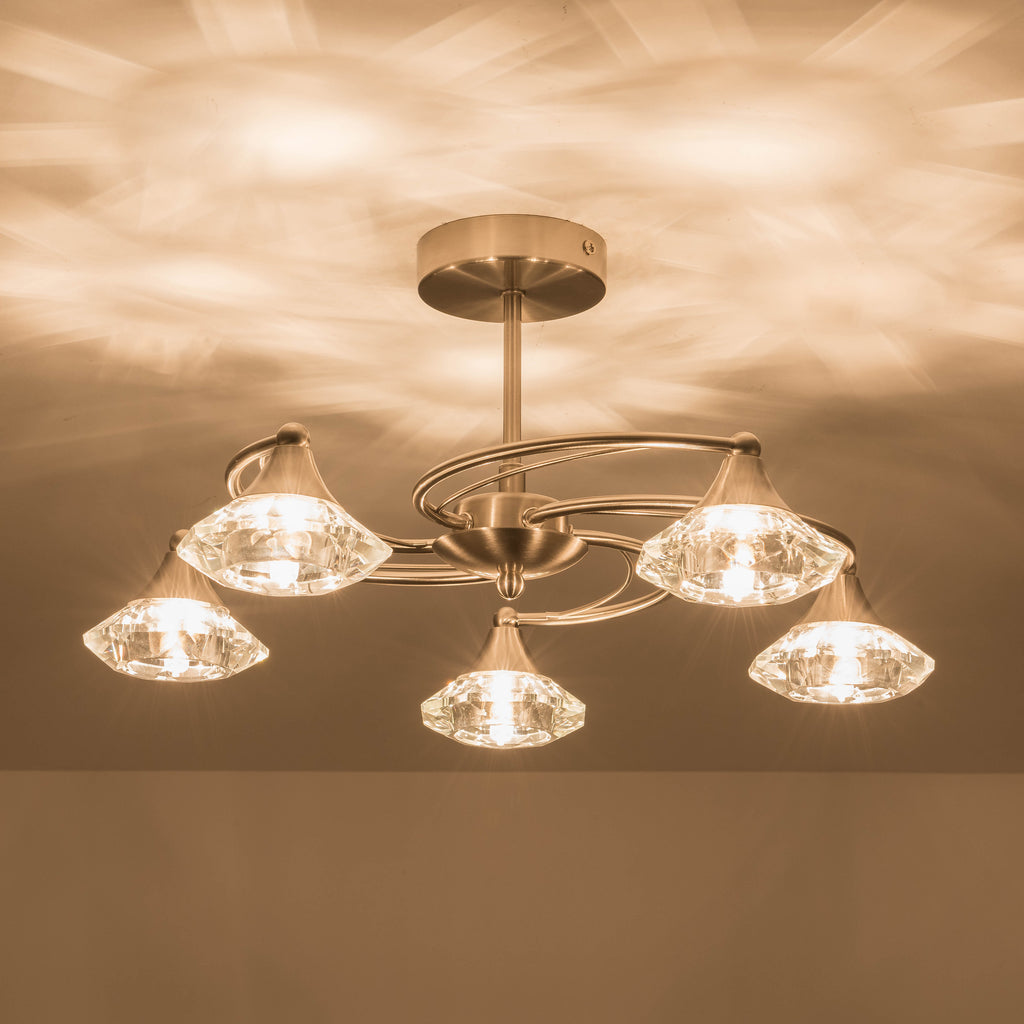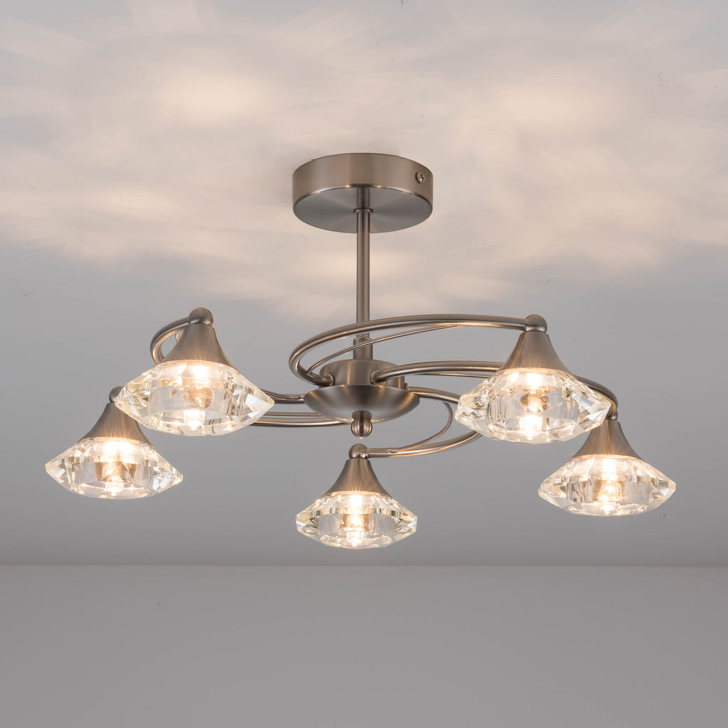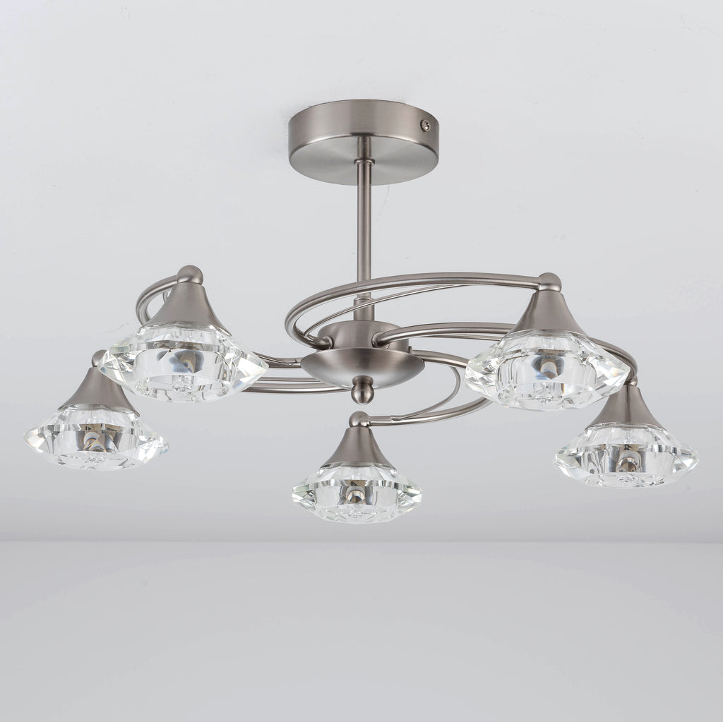 5 Lights Semi-Flush Ceiling Light, Satin Nickel Finish, Faceted Octagonal Glass Shades, Dimmable